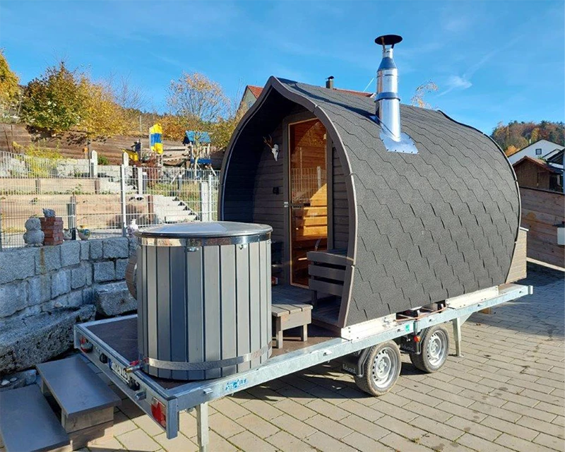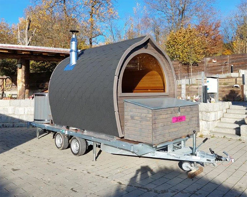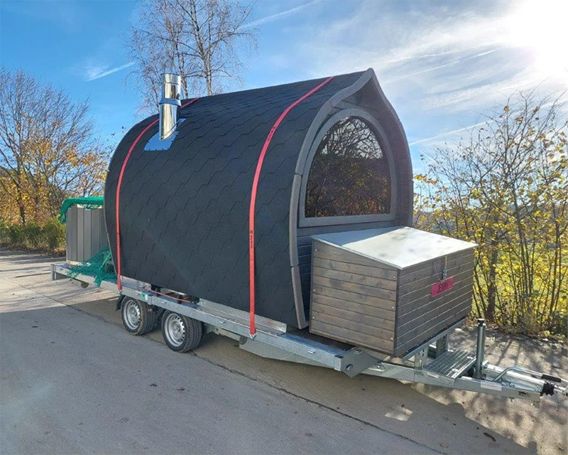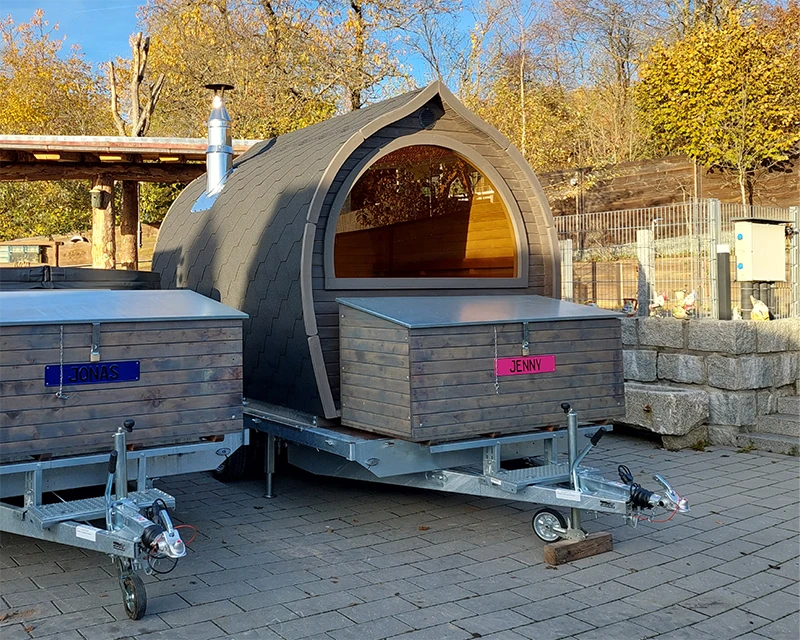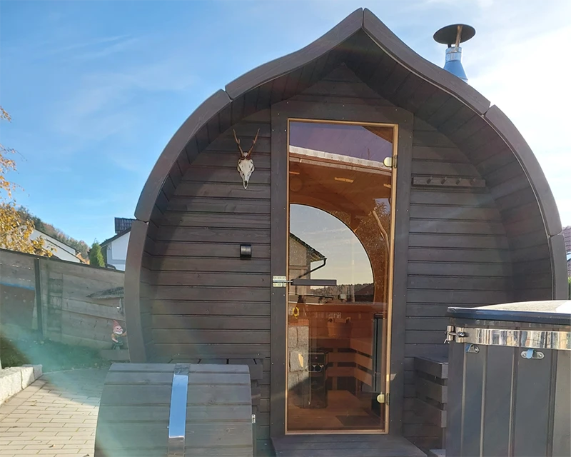 Unsere mobile Iglu-Sauna vereint rustikalen Charme mit modernem Komfort und bietet ein einzigartiges Saunaerlebnis für bis zu sechs Personen. Neben dem großzügigen Saunaraum lädt eine gemütliche Außenveranda mit Sitzgelegenheit und 500 l Tauchbecken zum Entspannen unter freiem Himmel ein.