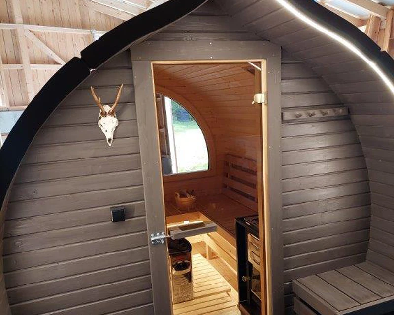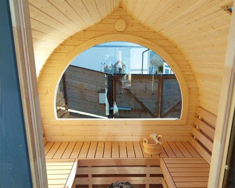 Der Innenraum besteht vollständig aus hochwertigem nordischem Fichtenholz und lässt sich flexibel nutzen – entweder mit zwei komfortablen Liegeflächen oder sechs Sitzplätzen. Ein großes Panoramafenster eröffnet dabei einen herrlichen Blick in die Natur und schafft eine offene, lichtdurchflutete Atmosphäre.